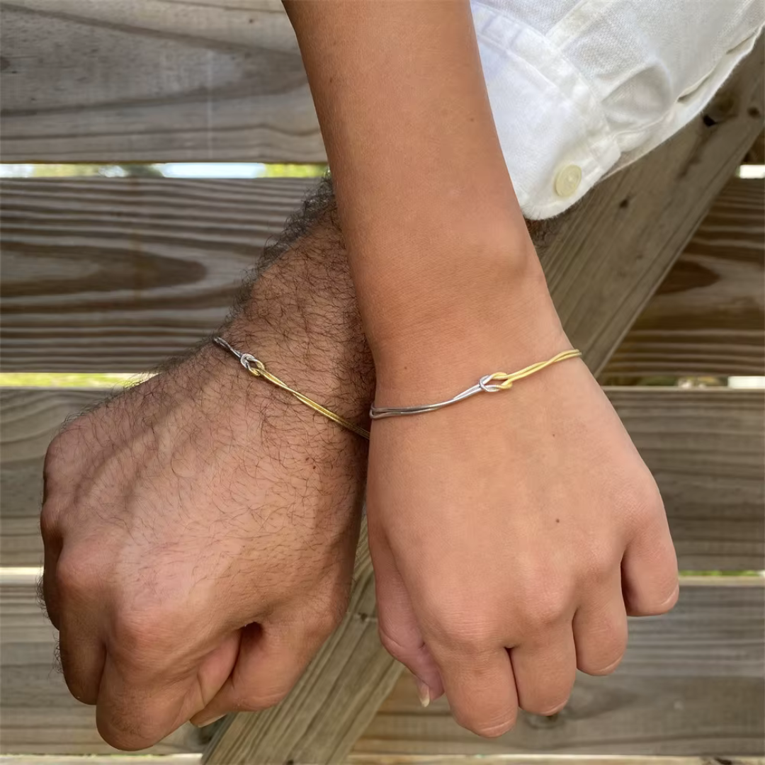En flytande tråd av guldpläterat rostfritt stål, len som silke, möts i en nätt knut—en symbol för samhörighet, styrka och tidlös stil. Dess fjäderlätta design vilar mjukt mot huden och ger en diskret touch av elegans till varje stund.